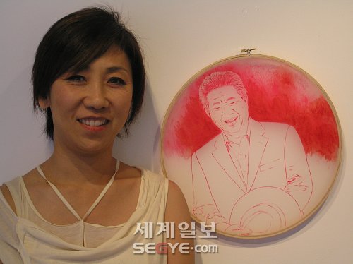 | ◇고 노무현 전 대통령을 그린 작품 앞에서 포즈를 취한 박유아씨. |
