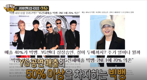 빅뱅은 YG 공연 매출의 50% 이상을 차지하고 있으며, 2016년에만 약 500억원의 수입을 올렸다는 것.