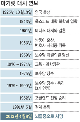 대처 전 총리는 1925년 영국 중부 그랜덤에서 식료품점을 운영하는 부모에게서 태어났다. 옥스퍼드대학 화학과를 졸업하고 1951년 데니스 대처와 결혼했다. 이후 쌍둥이 남매를 낳고 변호사 자격증을 취득한 대처는 정계에 발을 들여놓았다. 1959년 보수당 하원의원에 당선됐고 의원이 된 지 2년 만에 연금·국민보험부 정무차관에 발탁됐다. 이후 주택, 연금, 재무, 에너지 담당부처의 요직을 거쳐 교육·과학장관에 기용됐다. 1975년에는 보수당 당수로 선출되면서 영국 최초의 여성 당수가 됐고, 이어 1979년 보수당이 집권 노동당을 누르고 승리하면서 영국 첫 여성 총리에 취임했다.