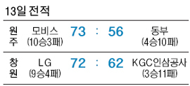 지난시즌 챔피언인 모비스는 13일 원주종합체육관에서 열린 2013∼14 프로농구 정규리그 동부와의 원정 경기에서 73-56으로 승리했다. 최근 6연승을 내달린 모비스는 10승3패로 서울 SK와 함께 공동 선두가 됐다. 또 동부를 상대로 최근 9연승을 기록하며 강한 모습을 보였다. 반면 동부는 9연패 수렁에서 헤어나지 못했다. 동부가 9연패를 당한 것은 전신인 삼보 시절인 2001년 12월 이후 12년 만이다.