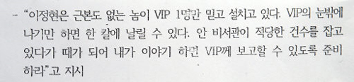 본지가 지난달 28일 보도한 문건에 이 전 수석과 관련한 부분은 정씨가 이 전 수석에 대해 ‘근본도 없다’고 표현하며 퇴출 준비를 ‘지시’했다(사진 참조)는 내용이다. 동아일보가 이미 보도한 사안이어서 이를 추가 공개한다. 전남 곡성 출신인 이 전 수석은 2004년 당시 한나라당 대표였던 박 대통령이 당 수석부대변인으로 발탁하면서 인연을 맺었다. 박 대통령 정치입문 시절부터 동고동락한 정씨와 소위 ‘문고리 3인방’(이재만 총무비서관, 정호성 제1부속비서관, 안봉근 제2부속비서관)에게 이 전 수석은 ‘적통’이 아닌 셈이다. 이 전 수석을 비하한 표현은 정씨와 3인방을 제외한 세력에 대한 강한 견제 심리가 깔려 있어 보인다. 이 최고위원은 문건 내용에 대해 “길이 아니면 가지 말고 말이 아니면 듣지 않겠다는 말 이외에 할 말이 없다”고 밝혔다.