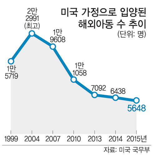 미국 국무부 사이트에 2008년부터 공개된 ‘아동수출 톱 5’ 국가에 한국은 한 해도 빠짐 없이 순위 안에 들었다. 2008년 1064명으로 5위, 2009년(1079명) 4위, 2010년(865명) 4위, 2014년(370명) 5위 등이었다. 2014년 한국보다 1인당 국내총생산(GDP)이 적은 인도네시아(1명), 말레이시아(1명), 남아프리카공화국(24명), 대만(69명) 등은 미국 입양아 수가 한두 자릿수에 불과했다. 세계에서 인구가 가장 많은 중국을 빼면 경제성장에 성공한 중진국 중 지난 8년간 미국 입양아 수 ‘톱 5’에 든 나라는 한국이 유일했다.