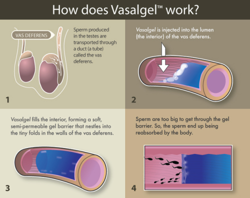 | 바살젤 작용 원리, 정관 내부에 막을 생성해 정자가 통과하지 못하게 막음. 허핑턴포스트 캡처. |