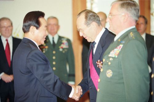 | 김영삼 대통령이 청와대에서 페리 미 국방장관에게 훈장을 수여하고 있다. 세계일보 자료사진 |