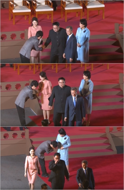 이어 김정은 위원장의 부인 리설주와 문재인 대통령의 부인 김정숙 여사에도 허리를 굽혀 인사했다.