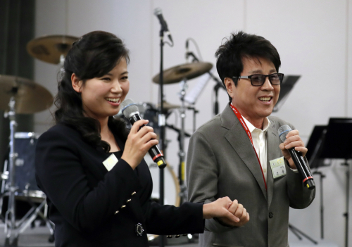 | 가수 조용필(오른쪽)과 현송월(왼쪽) 삼지연관현악단 단장이 27일 경기 파주시 판문점 평화의 집에서 열린 남북정상회담 만찬에서 공연을 하고 있다. 판문점=사진 공동취재단 |
