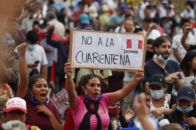페루 수도 리마에서 지난달 31일(현지시간) 코로나19 봉쇄 조치에 반대하는 시위 참가자들이 정부 정책에 항의하는 문구가 새겨진 손팻말을 든 채 구호를 외치고 있다. 프란시스코 사가스티 페루 대통령은 최근 코로나19를 최악의 보건·경제 위기로 규정하고 바이러스 확산 최소화를 위해 페루 25개 지역 중 10개 지역에 봉쇄 조치를 내렸다.