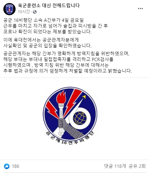 군 제보채널인 ‘육군훈련소 대신 전해드립니다’(육대전)은 7일 “경북 예천의 공군 16전투비행단 소속 A간부가 지난 4일, 금요일 근무 후 술집과 피시방을 찾았다가 코로나19 확진판정을 받았다는 제보가 들어왔다”고 했다.