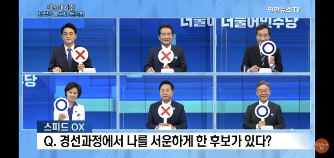이날 TV토론 스피드퀴즈 코너에서는 후보 간 미묘한 신경전도 엿볼 수 있었다. ‘경선 과정에서 나를 서운하게 한 후보가 있다?’는 질문에 이낙연·추미애·이재명 후보는 O를, 박용진·정세균·김두관 후보는 X를 택했다. 특히 최근 치열한 네거티브 공방을 벌이는 이재명·이낙연 후보 모두 ‘그렇다’고 답한 점이 눈길을 끌었다.