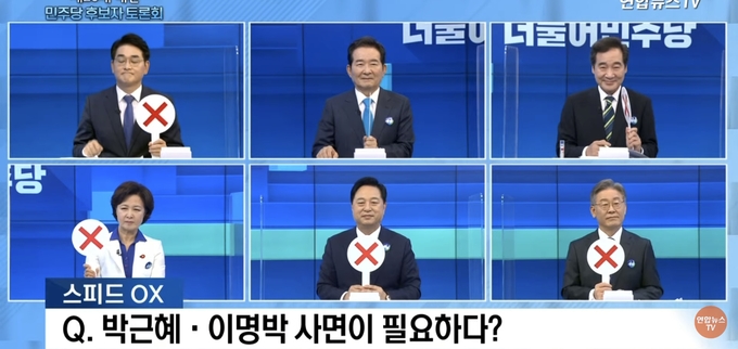 28일 민주당 대선 본경선 첫 TV토론에서 6명의 경선 후보들은 스피드 퀴즈 코너에서 ‘박근혜·이명박 사면이 필요하다?’는 질문에 이같이 4대2로 입장이 갈렸다. 양면에 O·X가 적힌 손팻말을 들어 답하는 해당 코너에서 이재명·추미애·박용진·김두관 후보는 X를 보인 반면, 이낙연·정세균 후보는 O도 X도 아닌 중간을 택했다.