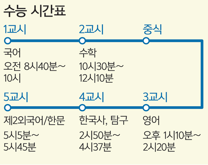 생체리듬을 수능에 맞추기 위해 수능을 치르는 시간에 온전히 깨어 있는 것도 중요하다. 수능은 오전 8시40분에 시작해 오후 5시45분에 제2외국어/한문 시험으로 끝난다. 진학사는 “이 시간 동안 시험에 온전히 집중할 수 있도록 평소 리듬을 조절해야 한다”며 너무 늦은 시간까지 공부해 낮 동안 집중하지 못할 경우 공부 패턴을 바꿔 볼 것을 추천했다.