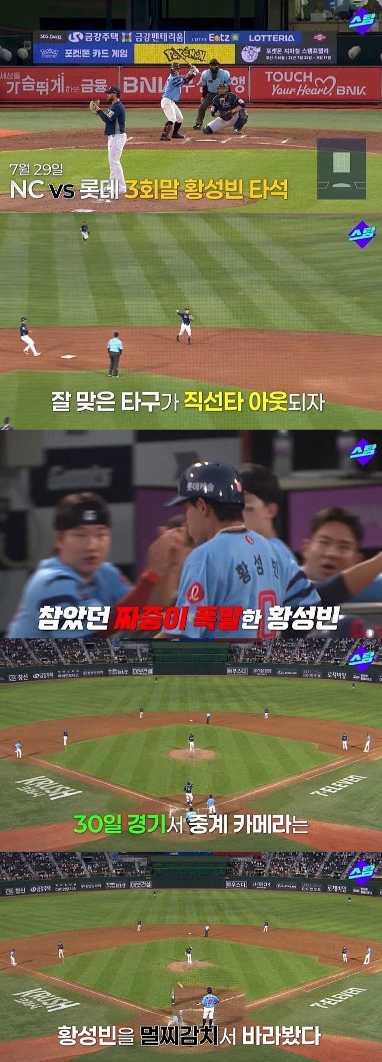 하지만 지난달 29일 경기에서 비슷한 상황이 반복돼 다시 한 번 화두에 올랐다. 두 번째 타석에서 아읏된 황성빈은 더그아웃에 돌아온 뒤 자신을 찍는 클로즈업 카메라를 향해 “아, 찍지 마요”라고 말하며 짜증 섞인 손짓을 보였다. 이후 헬멧을 바닥에 던지며 격한 감정을 표출했다. 이 장면 역시 중계화면에 실시간으로 송출되며 팬들의 비판이 이어졌다.