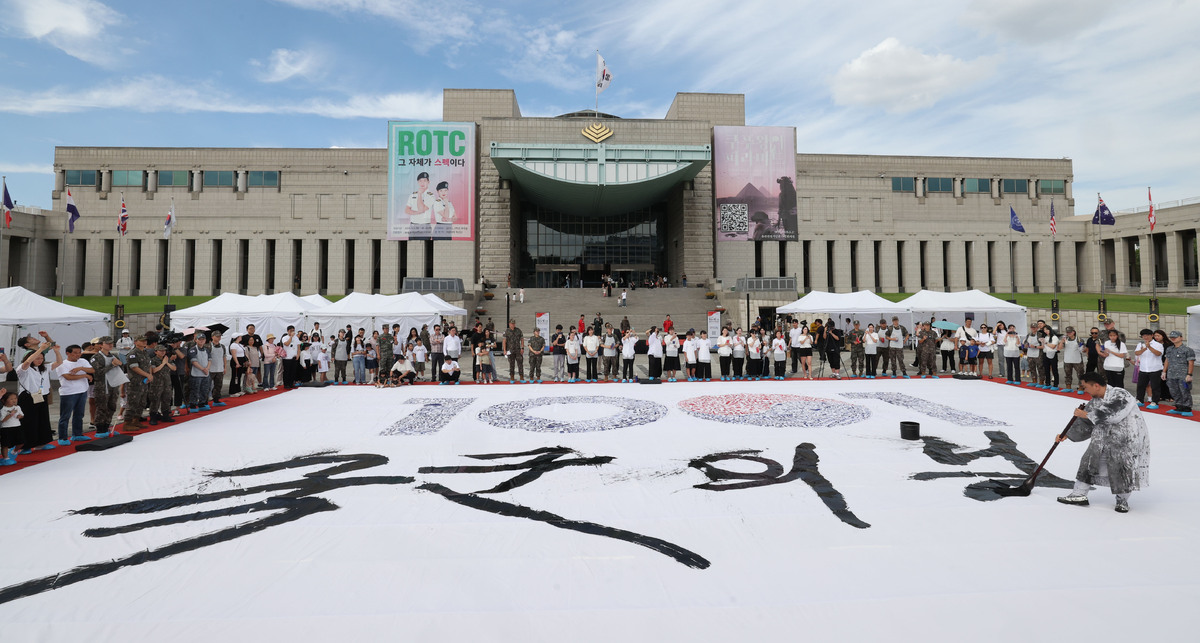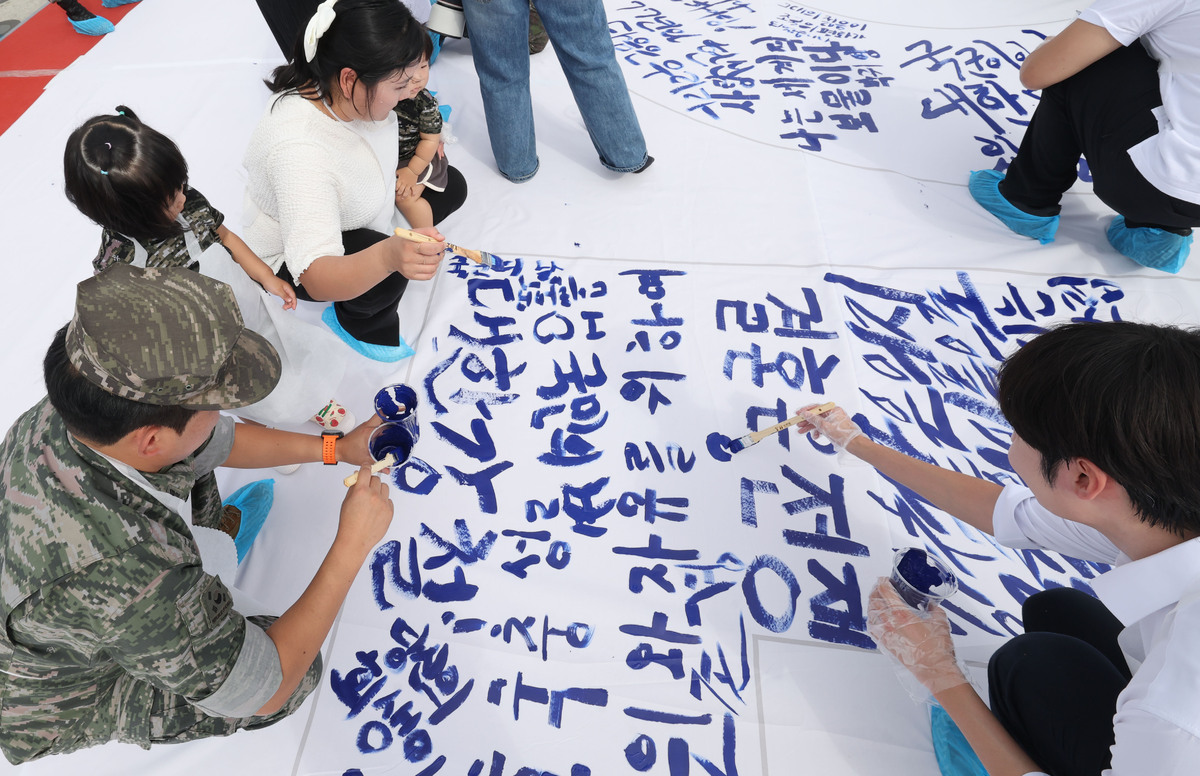 건군 77주년 국군의날 행사기획단 주최로 14일 서울 용산구 전쟁기념관 평화의 광장에서 '국군의날 기념 대형 캘리그라피 제작 행사'가 열리고 있다.