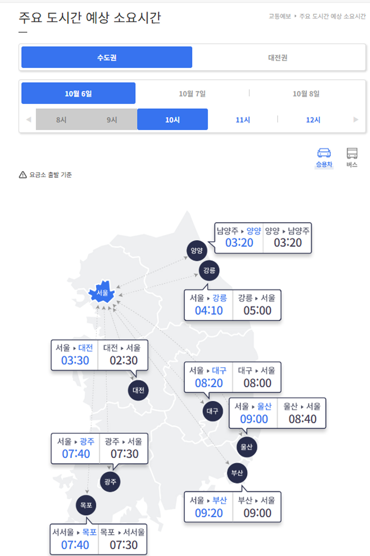 주요 도시 간 예상 소요시간은 한국도로공사 홈페이지에서 검색할 수 있다.
