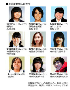 10일 일본 아사히신문 등 일본 주요 일간지에 따르면 이날 일본 경시청은 최초 신원이 밝혀진 타무라 아이코(23) 외에 8명의 신원을 확인했다. 10대 여성이 4명, 20대 여성이 4명, 20대 남성이 1명이었다.