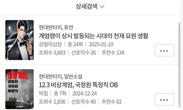 '탄핵 2025'처럼 계엄을 선포하는 대통령의 복잡한 심리를 1인칭 주인공 시점에서 서술한 작품, 은퇴한 국정원 블랙요원이 계엄 선포 직후 현업에 복귀하는 첩보물('12·3 비상계엄, 국정원 특정직 OB')도 올라왔다.