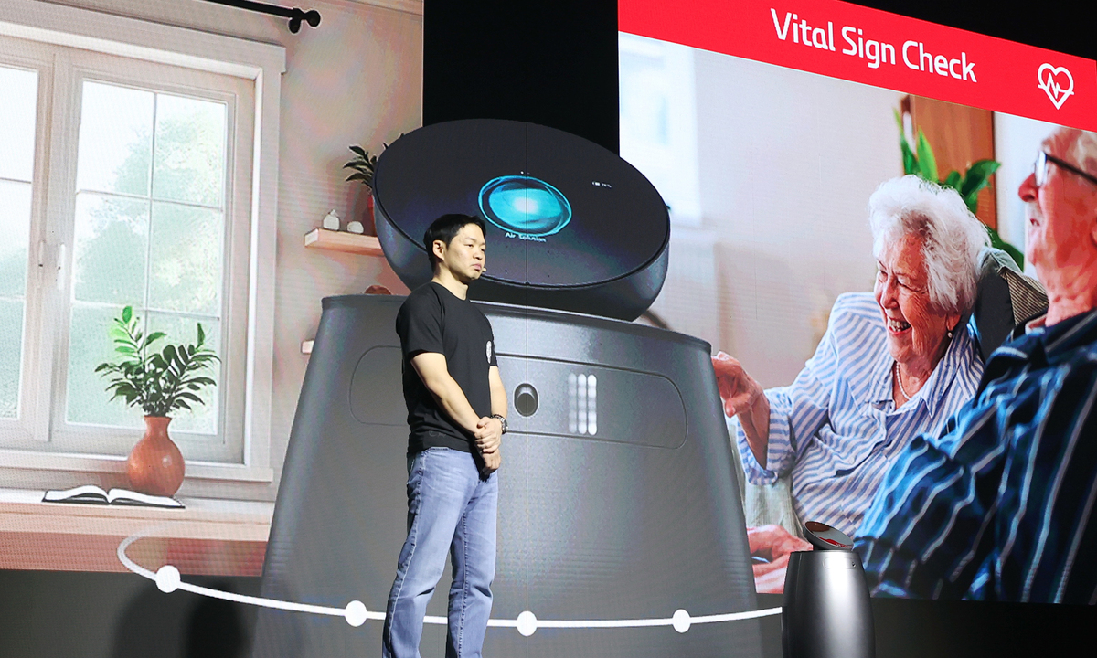 이어진 제품 시연에서는 웰니스 로봇의 주요 기능인 ▲에어 솔루션(Air Solution) ▲바이탈 사인 체크(Vital Sign Check) ▲대화형 서비스 등을 선보여 큰 주목을 받았다.