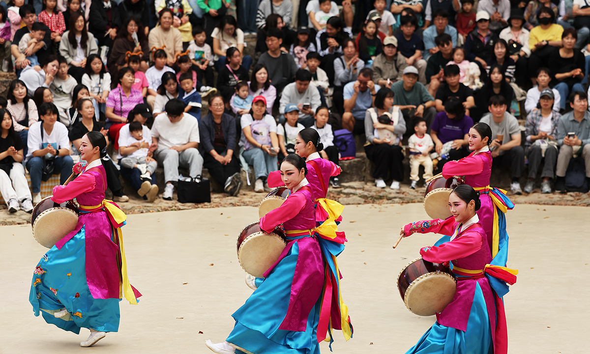 전통공연 신명나네∼ 입력 : 2025-10-09 21:32:19 수정 : 2025-10-09 21:32:18 구글 네이버 유튜브 추석 연휴 마지막 날이자 한글날인 9일 경기 용인시 한국민속촌을 찾은 시민들이 ‘삼도판굿’ 공연을 지켜보고 있다. 삼도판굿은 한국민속촌 측이 충청과 호남, 영남 등 전국의 유명 농악가락을 현대적으로 재구성한 전통공연을 일컫는다. <연합>연합> Copyright ⓒ 세계일보. 무단 전재 및 재배포 금지 연합