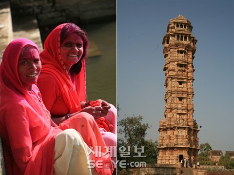 | ◇치토르가르 성에 순례 온 인도 여성들.(왼쪽)◇치토르가르 성의 승리 탑. |
