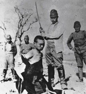 | ◇난징대학살 당시 일본군 병사가 일본도로 중국 민간인의 목을 치려 하고 있다. |