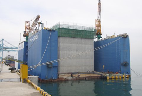 안벽 축조를 위해 물속으로 빠뜨리고 있는 ‘케이슨’(철근콘크리트로 된 상자 형태의 구조물)은 최대 무게가 1만5000t에 달한다. 부두 건설에 들어가는 케이슨 76개의 무게가 99㎡(30평형)짜리 아파트 2230채 무게와 맞먹는다고 회사 측은 설명했다.
