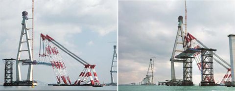 | ◇영종도와 인천 송도신도시를 잇는 길이 21.27㎞의 인천대교 건설현장에서 3000t짜리 대형 크레인을 이용한 상판 설치 작업이 진행되고 있다. 삼성물산 제공 |
