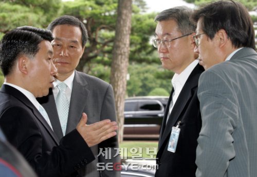 | ◇청와대 이동관 대변인(왼쪽)이 11일 청와대에서 강윤구 사회정책수석(왼쪽 두 번째), 김성환 외교안보수석(왼쪽 세 번째), 박형준 홍보기획관과 금강산 관광객 피격사건에 대해 얘기하고 있다. /이제원 기자 |