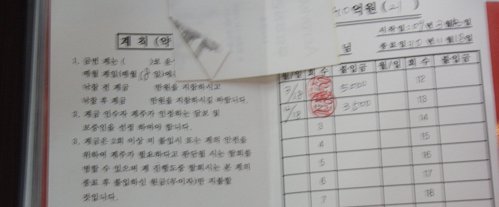 | ◇강남 계모임 ‘모나와따스함’ 계원 A씨가 곗돈을 받지 못한 채 새 계좌에 들면서 받은 장부. 지난 3, 4월 그는 새 계좌에 돈을 내지 않았으나 각각 5000만원, 3500만원을 냈다는 확인 도장이 찍혀 있다. |