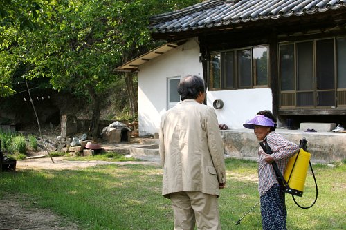 | ◇경남 거창군 가조면 석강리, 이기철 시인의 옛집 마당. 주인 노파가 텃밭에서 약을 치다 말고 분무기를 짊어진 채 돌아와 객들을 맞는다. 시인이 다가가 공손히 사연을 고하자, 노파는 음료수라도 들고 가라며 잡아 끌었다. 시인은 늙은 어미 같은 그 노파의 손에 담배값이라며 한사코 지폐를 쥐어주었다. |