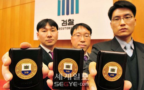 | ◇30일 오전 서울 서초동 대검찰청 ‘검찰 배지 수여식’에서 수사관들이 김준규 검찰총장에게서 받은 배지를 들어보이고 있다. 남제현 기자 |
