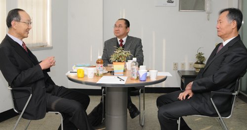 | ◇나란히 서울대 명예교수로 있는 우리나라 보수·진보의 좌장 안병직 사단법인 시대정신 이사장(오른쪽)과 백낙청 계간 ‘창작과 비평’ 편집인(왼쪽)이 박재창 숙명여대 교수의 사회로 시대정신 회의실에서 특별대담을 하고 있다. |
