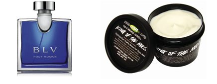 | 좌: 불가리의 ‘블루 옴므’ , 우: 러쉬의 부드러운 질감의 촉촉한 헤어젤 ‘킹오브더 모즈’ |