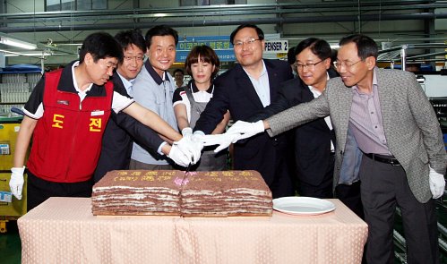 | ◇이영하 LG전자 HA사업본부장(오른쪽에서 세번째) 등 LG전자 직원들이 협력업체인 ‘이코리아’를 방문해 애로사항 및 고충 등을 듣고 상생 협력을 다지는 기념 떡 컷팅을 하고 있다. LG전자 제공 |