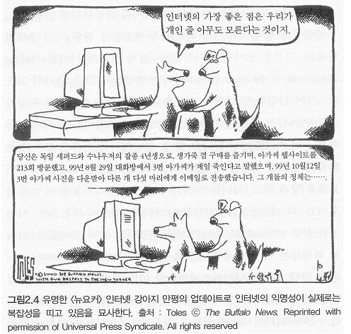 인터넷이 1990년대 중반 상업화 된 이후 가장 문제가 되었던 논란중 하나는 익명성(anonymity)이었다. 익명성은 표현의 자유를 확대한다는 장점이 있지만, 반대로 익명을 가장한 타인의 정보인권침해와 관련된 논란도 제공하고 있다. 1993년 <뉴요커> 잡지에 Peter Steiner의 삽화에서 개가 인터넷을 하는 장면은 인터넷 익명성의 한 단면을 보여주었다. 하지만 인터넷이 도입된 지 18년이 되었지만 여전히 인터넷 익명성 논란은 정치?사회적으로 계속되고 있다.