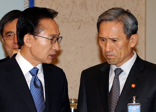 ◇이명박 대통령과 김관진 국방장관(오른쪽)이 21일 오전 청와대에서 국무회의에 앞서 심각한 표정으로 대화하고 있다.