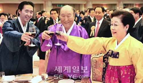 ◇8일 경기도 가평 천주청평수련원에서 열린 통일교 창시자 문선명 총재 탄신 91주년 축하연에서 문선명·한학자 총재 내외가 문국진 통일그룹 재단이사장의 건배 제의로 문형진 통일교 세계회장(왼쪽)과 함께 축하의 잔을 들고 있다.