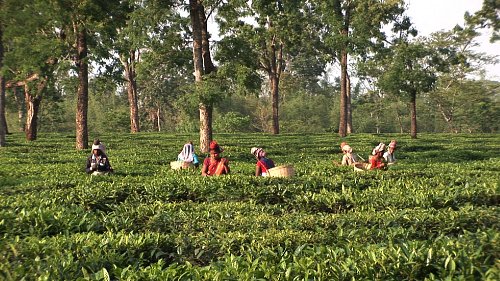 | 향이 짙은 홍차가 나는 것으로 유명한 인도 아삼 지방의 차밭에서 농부들이 차를 수확하고 있다. |