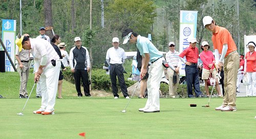 | 세계일보와 스포츠월드가 22일 경기도 포천 포레스트힐 컨트리클럽에서 공동 주최한 ‘소아암 어린이 돕기 VIP초청 자선골프대회’에서 퍼팅 콘테스트 참가자들이 실력을 겨루고 있다. 포천=김창규 스포츠월드기자 |