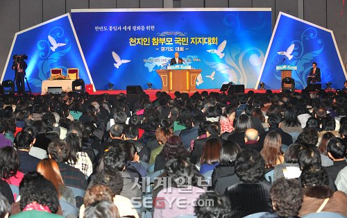 | 문선명 통일교 총재가 8일 경기 일산 킨텍스에서 ‘한반도 통일과 세계평화’를 주제로 올해 첫 특별강연을 하고 있다. 일산=허정호 기자 |