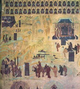 | 7세기 경에 그려진 것으로 알려진 장건출사서역도(張蹇出使西域圖). 그림 아래쪽에 무제가 말 위에서 손을 들어 장건에게 명령을 내리고 장건이 무릎을 꿇은 장면이다. |