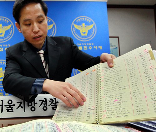 | 서울지방경찰청 국제범죄수사대원이 10일 국내 항공사 여승무원 등의 밀반출 거래 내역이 적힌 장부를 들고 설명하고 있다. 연합뉴스 |