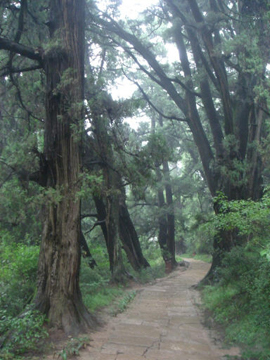 | 측백나무 숲. 역도(驛道) 주변에 심은 측백나무가 긴 세월이 지나 무성한 측백나무 숲이 되었다. 둘레 2미터 이상 된 나무는 진나라 때 심은 것이다. |