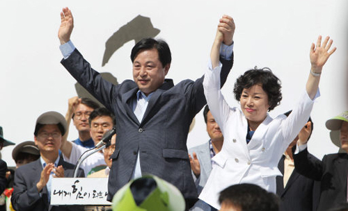 민주통합당 대선주자인 김두관 전 경남지사가 8일 전남 해남군 땅끝마을에서 대선 출마를 선언한 뒤 부인 채정자씨 손을 잡고 지지자들에게 인사하고 있다.