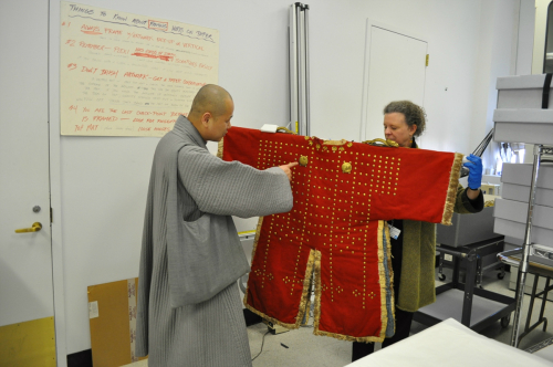 | 홍색의 제왕갑옷을 살펴보는 혜문 스님 |