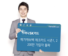 하나SK카드의 ‘메가캐쉬백2 체크카드’는 지난해 체크카드 판매 1위를 기록한 상품이다. 전 분야에서 월 최대 10만원까지 캐쉬백이 가능하다. 요식·마트·백화점·온라인쇼핑·주유·병원 등에서 2만원당 200원, 그외 업종에서는 2만원당 100원이 캐쉬백된다. 통신요금은 3만∼8만원 미만 결제 시 3000원, 8만원 이상 결제 시 5000원 캐쉬백이 가능하다. 캐쉬백된 금액은 지정계좌에 현금으로 입금된다. 빕스·피자헛·뚜레주르·미니스탑·롯데시네마 등 OK캐쉬백 특별 가맹점에서는 10∼30%까지 할인받거나 OK캐쉬백 5∼15% 적립이 가능하다. 전월 사용금액 25만원 이상 시 SK주유소에서 OK캐쉬백 기본 적립률의 3배까지, 커피빈과 할리스에서 5000원 이상 결제 시 OK캐쉬백 1000포인트 적립도 가능하다.