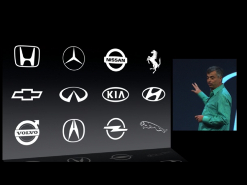 | ▶ 애플이 10일 개발자 컨퍼런스에서 iOS in the car가 적용되는 12개 자동차 브랜드를 소개하고 있다. 국내에서는 현대자동차와 기아자동차, 쉐보레가 포함됐다. |