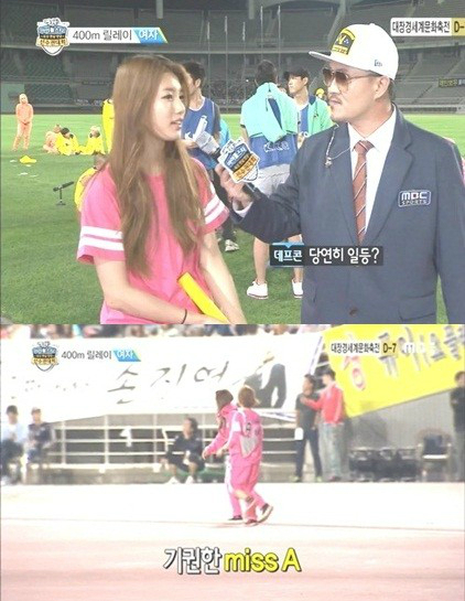 수지는 100m 부진한 성적에 "400m 잘하려고 몸을 사렸다"며 해명 아닌 해명을 하고는 민망한 웃음을 짓기도. 하지만 400m 달리기에서도 수지는 여전히 느릿한 속도로 부진한 면을 보여 아쉬움을 자아냈으며 결국 기권을 선택, 미쓰에이는 완주를 포기했다.