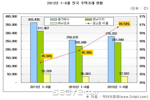 부동산 포털 닥터아파트가 국토교통부 실거래가 통계를 분석한 결과, 올해 1~8월 사이 전국 아파트 거래건수 27만9222건 가운데 86.5%인 24만1640건이 중소형인 것으로 나타났다. 최근 3년간 중소형 거래비율이 갈수록 늘어나고 있다.