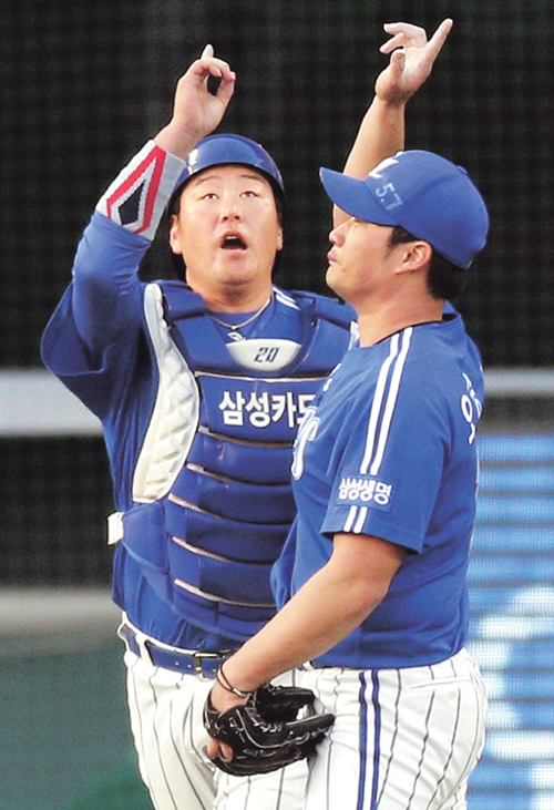 | 프로야구 삼성의 투수 오승환(오른쪽)이 27일 잠실구장에서 열린 두산과의 한국시리즈 3차전에 마무리로 등판해 팀의 3-2 승리를 지켜낸 뒤 마운드에서 포수 진갑용과 신나는 세리머니를 펼치고 있다. 연합뉴스 |