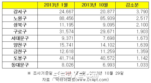 1000가구 이상 감소한 곳은 ▲구로구(1903가구) ▲서대문구(1673가구) ▲양천구(1639가구) ▲금천구(1359가구) ▲도봉구(1142가구) ▲동대문구(1033가구) 등이었다.
